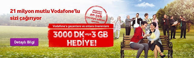Eğer 18 Mart 2015 tarihine kadar GSM numaraları Vodafone’a numara taşıma yolu ile taşınmış ise veya herhangi bir şekilde Vodafone’da bulunmuş ise, tek seferde 60 gün boyunca yurt içi Vodafonelularla geçerli hediye 3000 dakika veya tekseferde yine 60 gün geçerli hediye 3 GB yurt içi internet hakkı yüklenecektir.